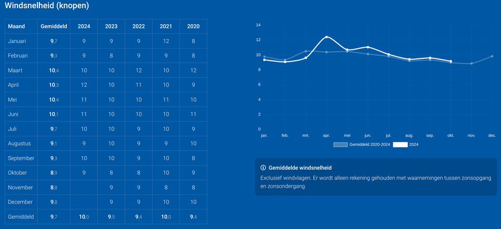 Op de eerste foto zijn de statistieken te zien van de gemiddelde windsnelheid in Monastir van het jaartal 2020 tot 2024.